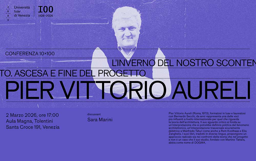 Prosegue con la conferenza di Pier Vittorio Aureli intitolata L’inverno del nostro scontento. Ascesa e fine del progetto – lunedì 2 marzo alle 17 nell’Aula Magna dei Tolentini – il ciclo 10 x 100, il programma di appuntamenti in occasione del centenario dell’Università Iuav di Venezia.