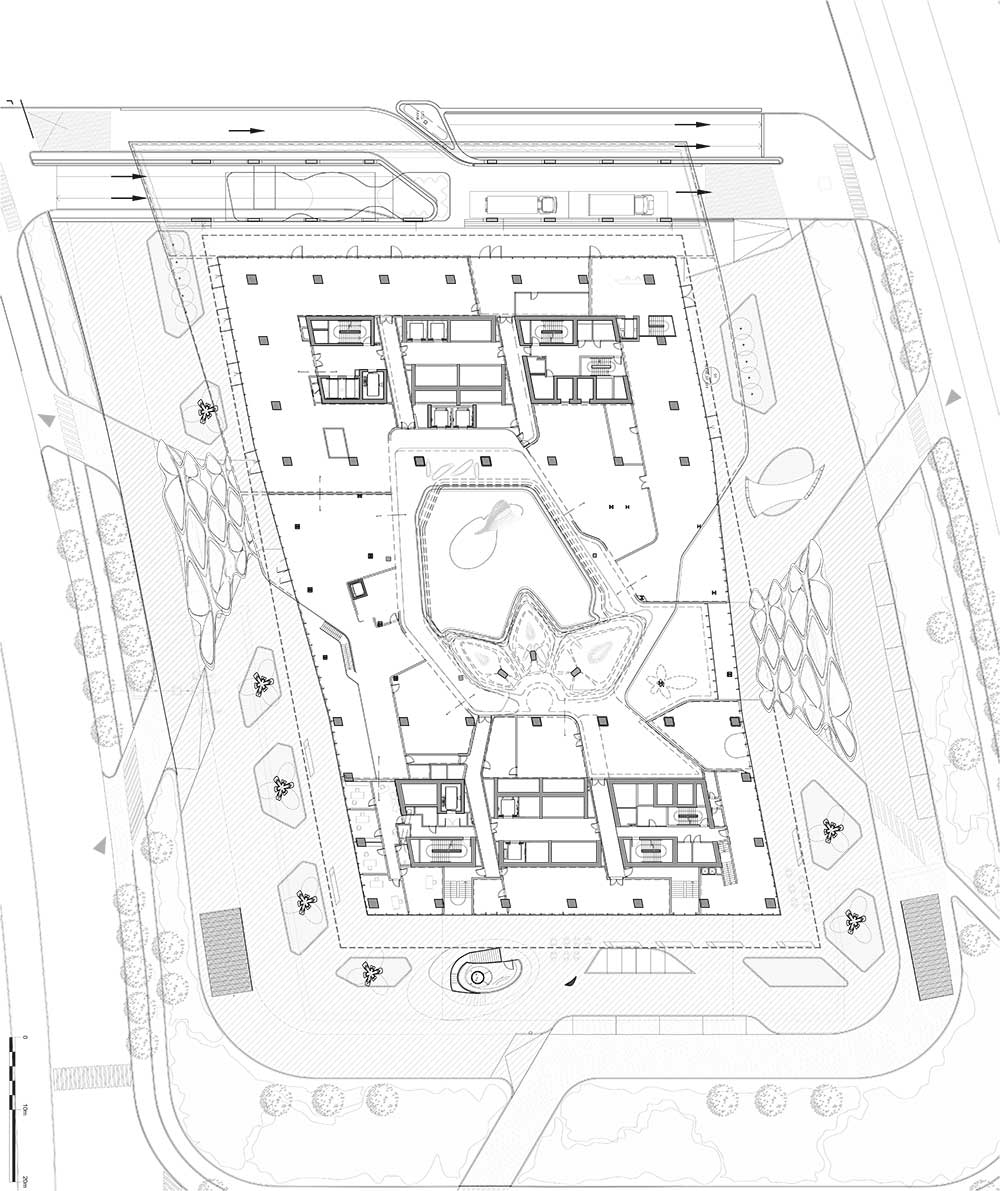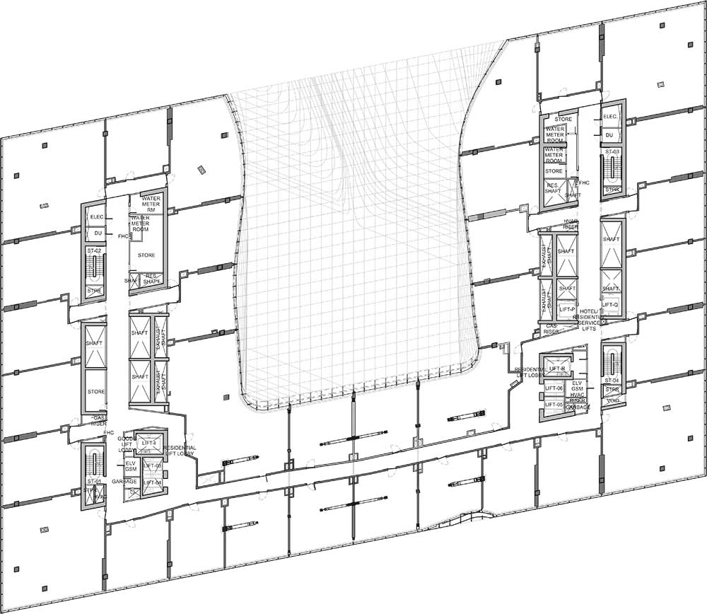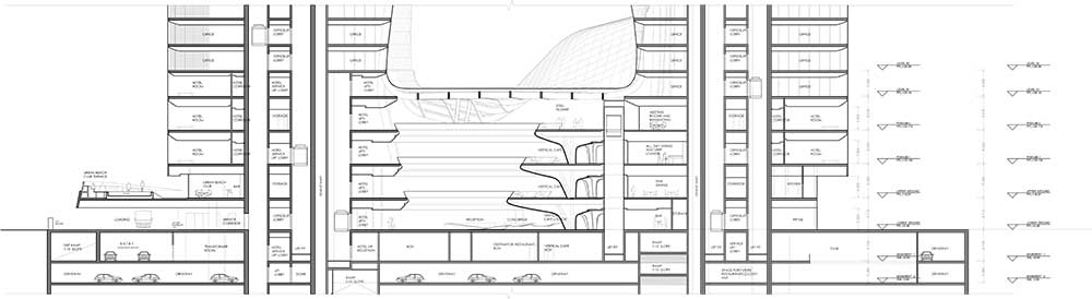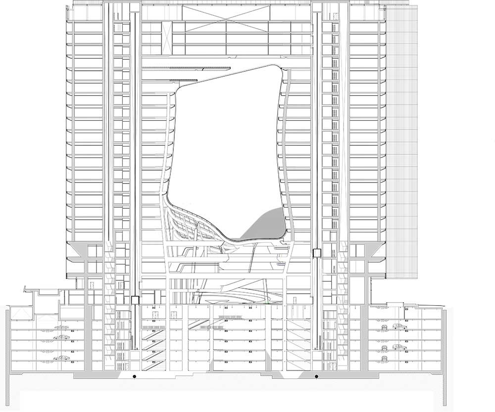 Opus si erge come un massiccio volume scavato da un grande spazio vuoto scolpito, fluido e organico che contrasta nettamente con la geometria ortogonale dell’involucro. L’edificio è costituito da due torri separate alte 93 metri, collegate tra loro da un atrio di quattro piani a livello del suolo, e da un ponte asimmetrico di tre piani largo 38 metri e sospeso a 71 metri di altezza da terra.