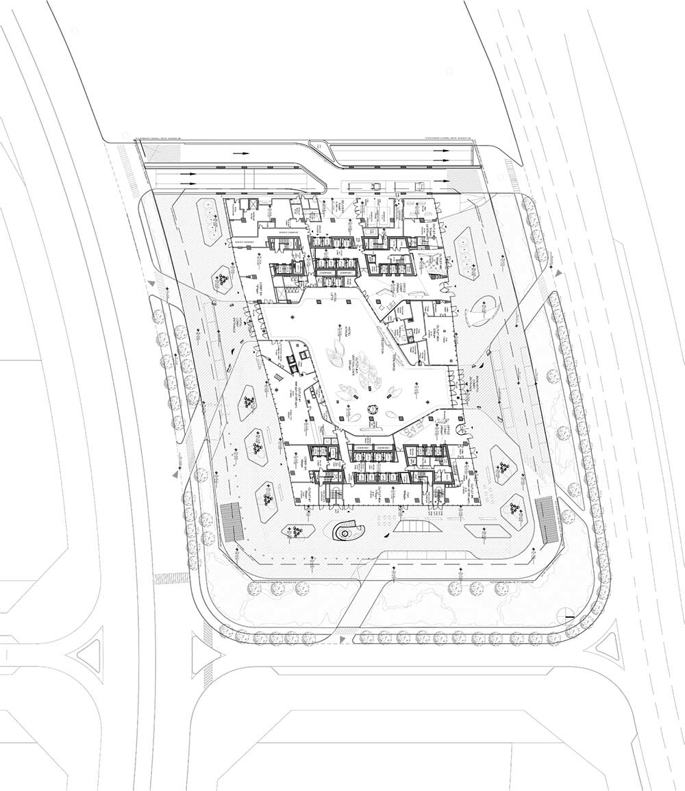 La facciata del vuoto è una superficie di 6.000 mq realizzata con 4.300 elementi di vetro piani, a singola o doppia curvatura. La facciata curva è stata progettata utilizzando la modellazione digitale 3D che ha anche identificato zone specifiche che richiedevano vetro temperato.