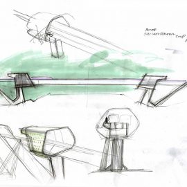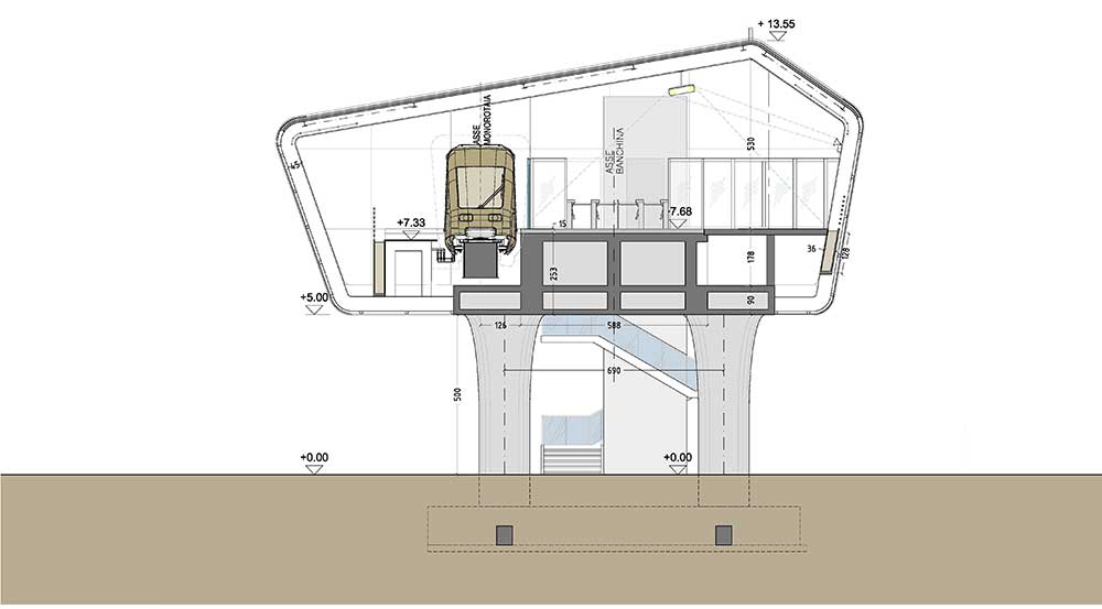 Progettare e vestire quest’opera infrastrutturale per Iosa Ghini è stata anche l’occasione per ribaltare l’opinione comune che considera le grandi infrastrutture solamente funzionali all’attività per la quale sono state progettate e realizzate: il People Mover di Bologna è un’opera architettonica realizzata attraverso la ricerca di soluzioni progettuali, stilistiche e di ricerca sui materiali che le donano valore estetico e ambientale.