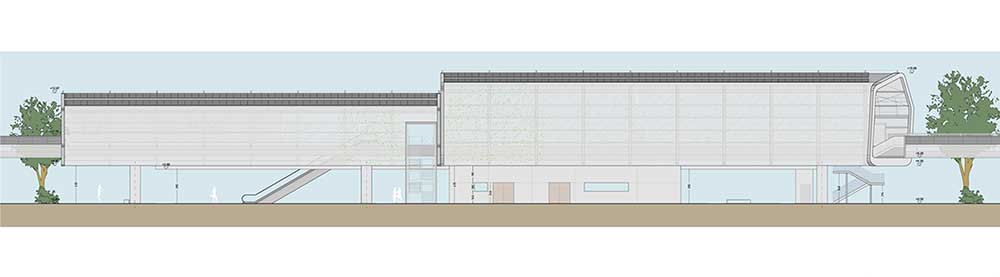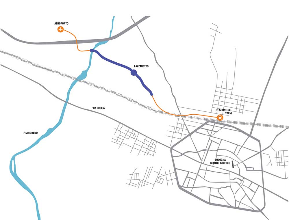 Il progetto preliminare, predisposto dal Comune di Bologna, aveva già individuato un tracciato a basso impatto ambientale, attraversando per la maggior parte del percorso aree ai margini della città, prive di abitazioni e fabbricati in genere. La preoccupazione del concessionario, infatti, è sempre stata quella di realizzare un’opera d’ingegneria che comunque si inserisse in modo equilibrato e compatibile con il contesto, con particolare attenzione al disegno delle pile e delle strutture delle tre stazioni. L’architettura dell’intero progetto tiene conto e conferisce priorità all’esigenza di efficienza energetica, di riduzione dell’impatto ambientale, del comfort e della qualità della fruizione per gli utenti. Il linguaggio architettonico rispecchia il desiderio di creare un progetto che possa interagire con la tecnologia delle nuove risorse energetiche, prestando attenzione ai problemi relativi alla qualità ambientale e al risparmio energetico. Il materiale utilizzato per le coperture delle stazioni – griglie in acciaio stirato – lascia entrare luce e aria, consentendo anche considerevoli risparmi in termini di illuminazione e di ventilazione.