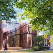 Come una quinta scenografica, davanti alla palazzina uffici una struttura in ferro sorregge un rivestimento di piccole lastre (20×20 cm) di Fior di Pesco Carnico® posate a ‘pixel’ per creare trasparenze e opacità.