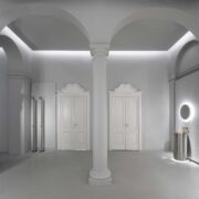 Tra le altre materie litiche per rivestimenti il Fior di Pesco Carnico, esclusivo di Margraf proveniente dall’unica cava al mondo dove si estrae questo marmo dalle peculiari tonalità che variano dal grigio al rosa e dal bianco all’avorio, e il marmo italiano Blue Sauvage dalle profonde venature blu scuro sui toni delicati del bianco.