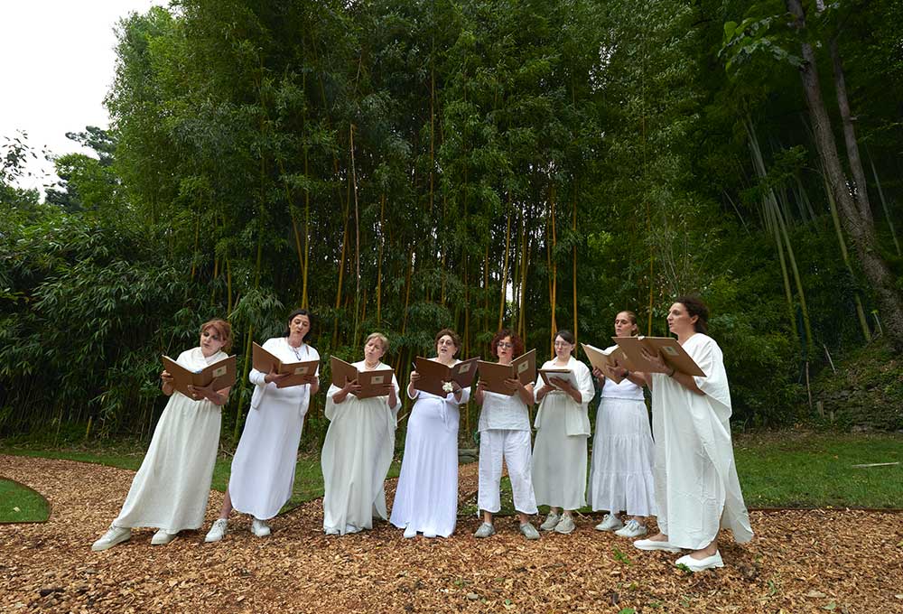 «Un’offerta al bosco, alla natura, dalle donne per le donne», spiega l’artista, che da anni esplora attraverso l’arte relazionale e ambientale il legame tra gesto, memoria e contesto. La composizione interna – un cerchio aperto disposto a terra – richiama simbolicamente il non-finito, lo spazio da riempire, la possibilità ancora da conquistare. Il giardino esterno, invece, si presenta come un’architettura leggera e fiorita, in cui i segni a terra disegnati in corten alludono a un labirinto che non imprigiona, ma apre nuove direzioni.