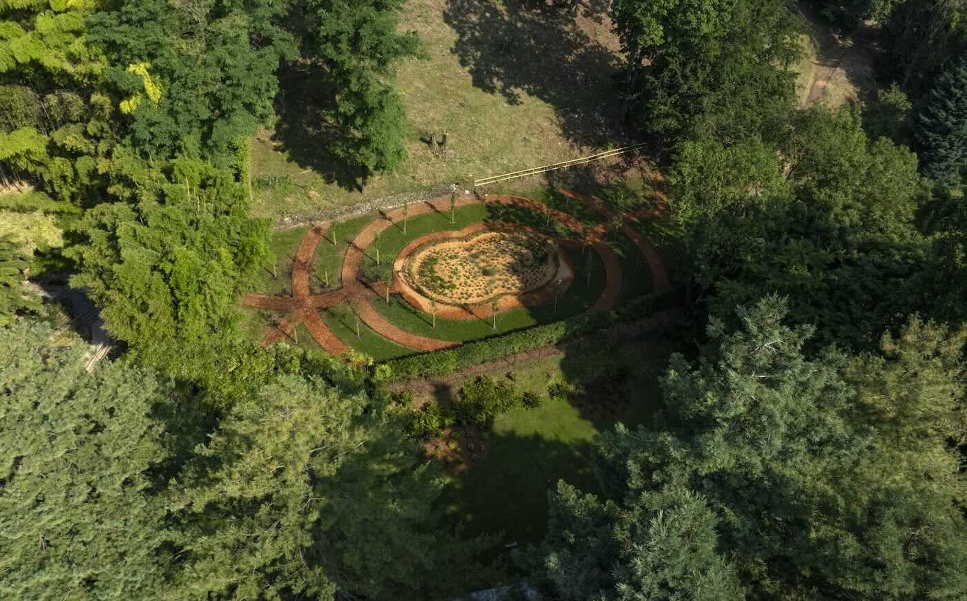 «Un’offerta al bosco, alla natura, dalle donne per le donne», spiega l’artista, che da anni esplora attraverso l’arte relazionale e ambientale il legame tra gesto, memoria e contesto. La composizione interna – un cerchio aperto disposto a terra – richiama simbolicamente il non-finito, lo spazio da riempire, la possibilità ancora da conquistare. Il giardino esterno, invece, si presenta come un’architettura leggera e fiorita, in cui i segni a terra disegnati in corten alludono a un labirinto che non imprigiona, ma apre nuove direzioni.