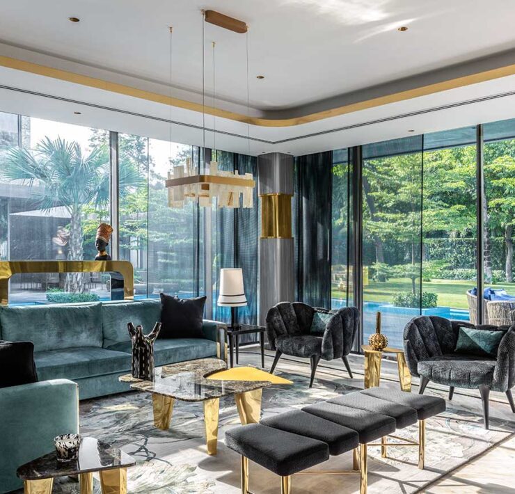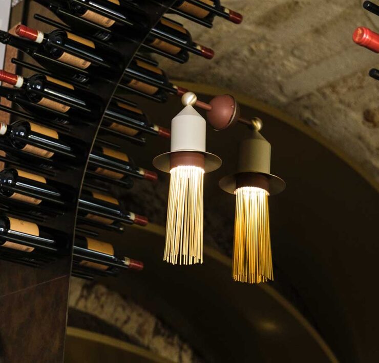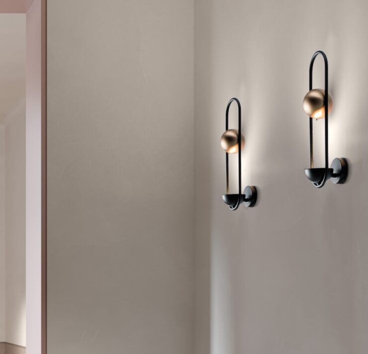 La famiglia Luppiter di Marco Zito, nata dalla geometria dell’ellisse, propone nuove varianti che combinano la struttura metallica nera con sfere in alabastro, elementi dorati e cappelli a campana in metallo spazzolato. Le proporzioni dei telai e la modularità dei componenti ne rafforzano la versatilità tra residenziale e contract.