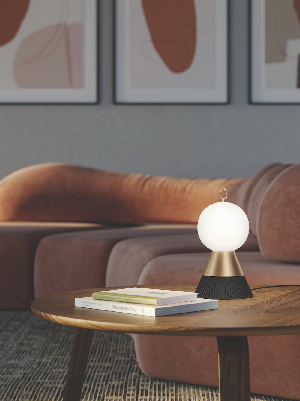 Nuovi colori anche per Cordea Tavolo, firmata Favaretto & Partners, che reinterpreta le luci industriali con una fascia in cuoio e un corpo in metallo a campana. Le nuove finiture matt – senape dorato, rosso terracotta e mocha vellutato – si combinano liberamente con le tre varianti di cuoio, mantenendo la fibbia in ottone come dettaglio identitario.