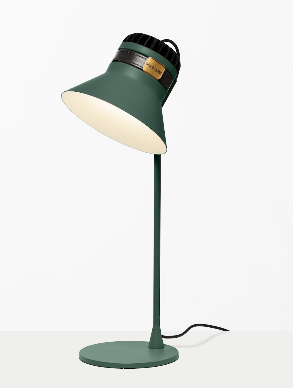 La lampada da tavolo di Favaretto & Partners in verde scuro. La fascia in cuoio è disponibile in tre varianti colore: nero, cuoio e rosso.