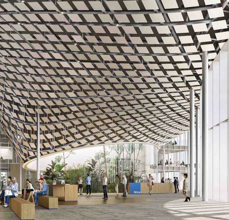 Al livello -1, visibile da ogni piano, una pedana verde con piante e sedute sarà la platea per appuntamenti ed eventi.