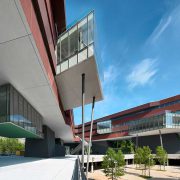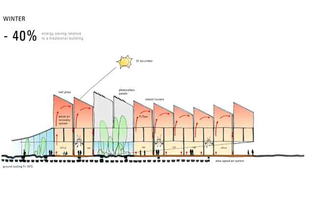 Inoltre, alcuni camini alloggiano 200 mq di fotovoltaico, mentre 5 mq di solare termico sono installati sulla copertura del corpo scale. Per migliorare la compatibilità ambientale si è fatto ricorso a materiali naturali sia per la struttura portante, in legno lamellare, sia per le pareti e le coperture, collocando uno strato isolante in fibra di legno all’interno di una struttura a montanti e traversi. Collegato ai pannelli radianti posti sulla sommità di alcuni camini e all’UTA con recuperatore di calore, l’impianto a pompa di calore geotermica o ad acqua di falda garantisce elevati livelli di comfort in tutte le stagioni. Il recupero dell’acqua piovana e il riutilizzo dell’acqua usata negli impianti termici contribuiscono al fabbisogno idrosanitario e a quello per l’irrigazione.