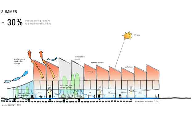 Nei disegni, studio dei risparmi energetici conseguibili grazie alla ventilazione naturale e agli apporti bioclimatici.