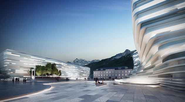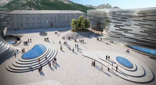 Una vista a volo d´uccello della nuova piazza su cui affacciano gli edifici del polo universitario della Valle d´Aosta (render Engram).