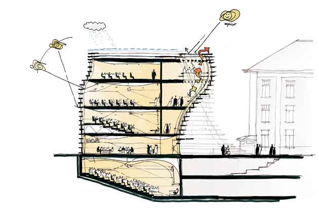 Una sezione usata per lo studio dei sistemi bioclimatici mette in evidenza anche il ricorso a spazi sotterranei per assolvere a funzloni (come convegni e assemblee) dove l´apporto di luce naturale non è un necessario fattore di confort.