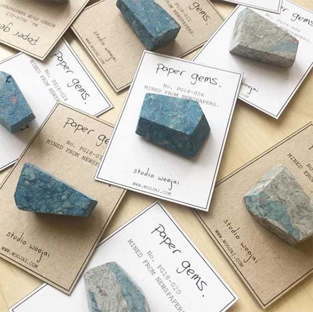 Design circolare: dal riciclo della carta di quotidiano Studio woojai – uno dei designer che esporranno con Ventura Future -ricava queste piccole paper gems |