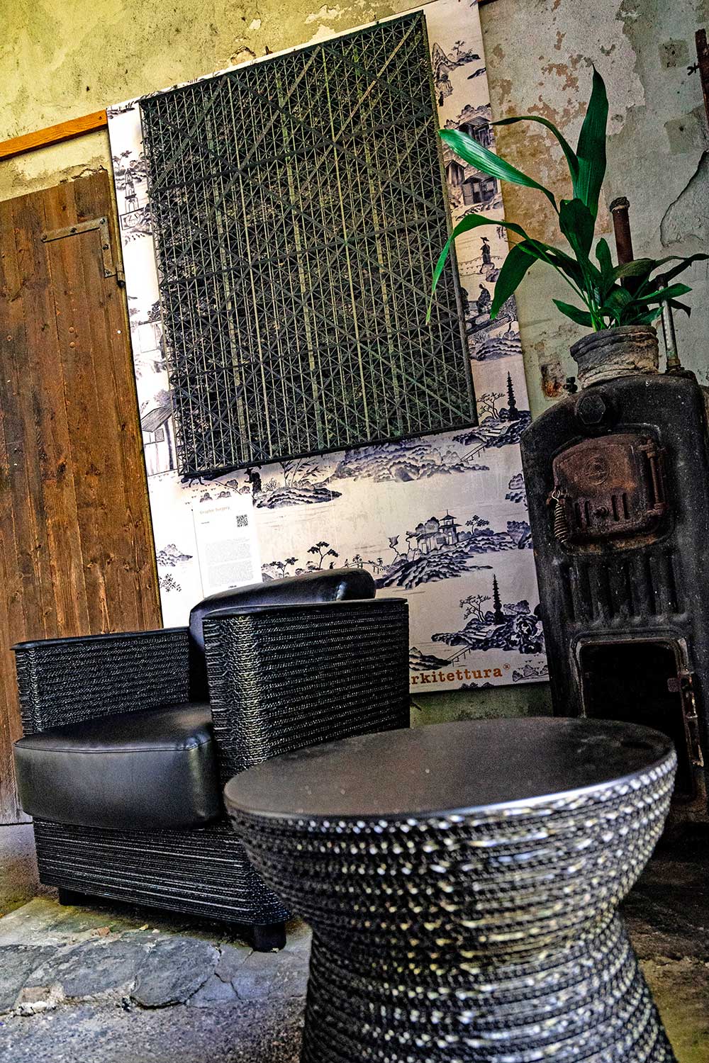 Cornice dell’allestimento il verde dei cortili che ha accompagnato la collettiva espositiva, un percorso in costante equilibrio tra arte e prodotto, tra le trame del tessuto tecnico di i-Mesh, i disegni e le superfici di Officinarkitettura, i riflessi materici di Forma&Cemento e il comfort di StayGreen, elementi che si sono compenetrati con i temi della mobilità sostenibile di Skoda e della sicurezza con Genertel.