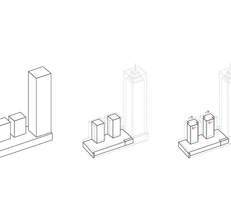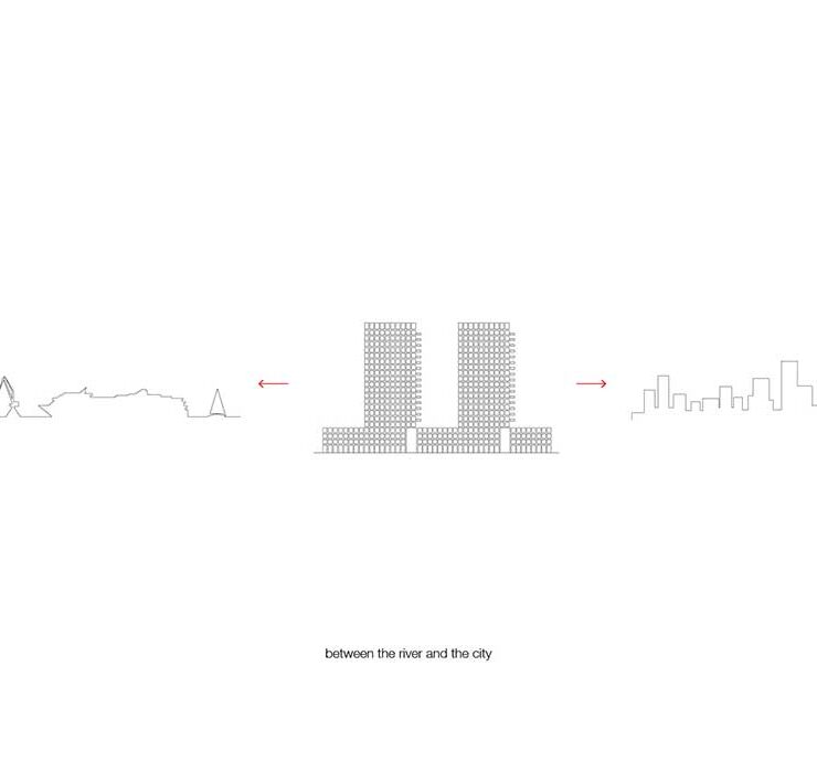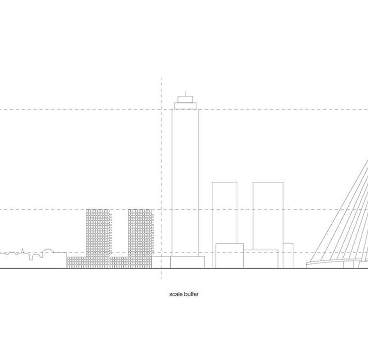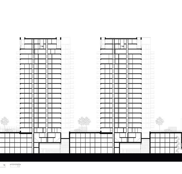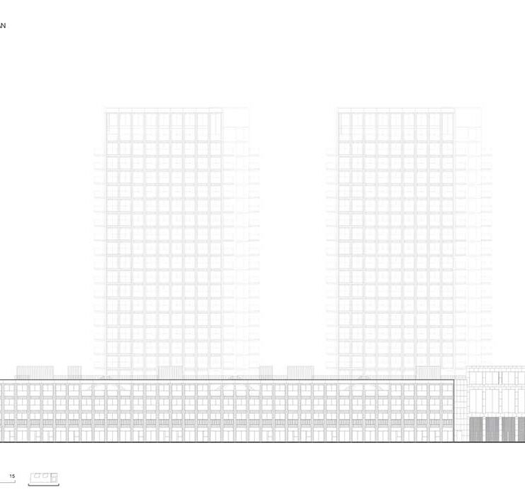La doppia scala dell’intervento di Kaan Architecten, pur salvaguardando la densità necessaria per il buon funzionamento dei servizi e delle infrastrutture urbane, dà così luogo a un più misurato oggetto urbano e coglie nel basamento comune alle due torri anche un elemento in grado di dare vita a un nuovo mix abitativo, con un ristorante e abitazioni ‘studio’ lungo il perimetro dei primi quattro livelli, con ingresso dalla strada, che potranno anche ospitare piccoli uffici.