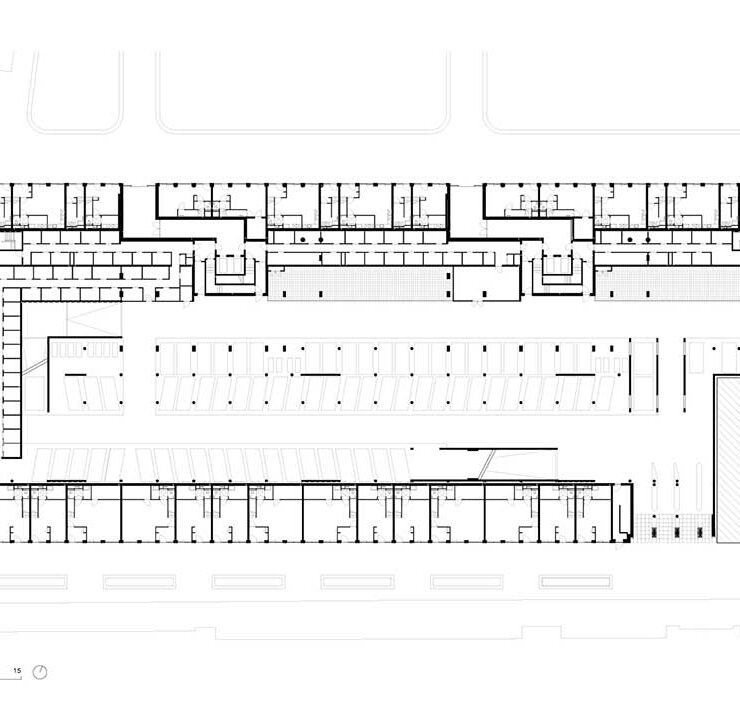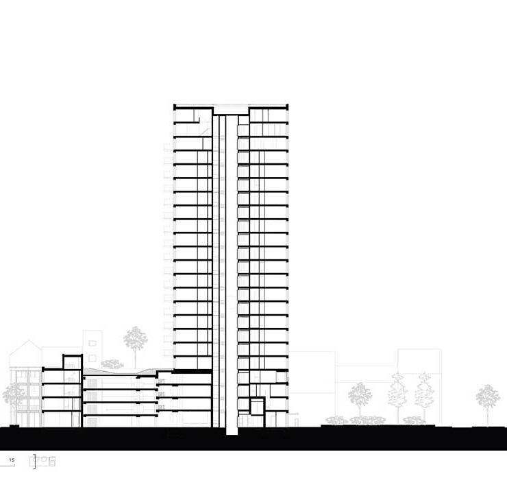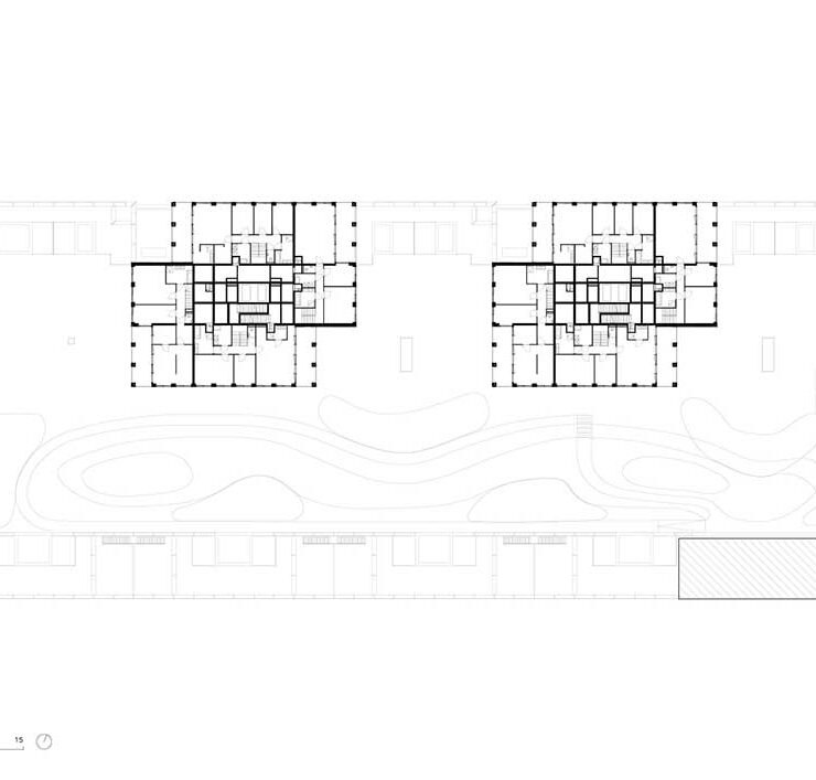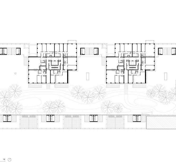Questi ambienti di possibile uso misto circondano e nascondono un parking su più livelli (con ingresso dalla facciata retrostante, su Houtlaan), a sua volta coperto da un giardino accessibile da tutti i residenti, che si aggiunge a un nuovo parco pubblico realizzato a nord del sito. Il basamento ricrea la cortina stradale del quartiere storico mentre i 452 appartamenti delle torri conservano una forte connessione con il verde e lo spazio aperto.