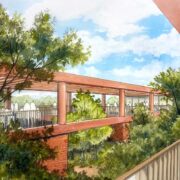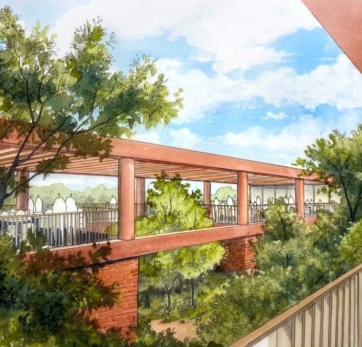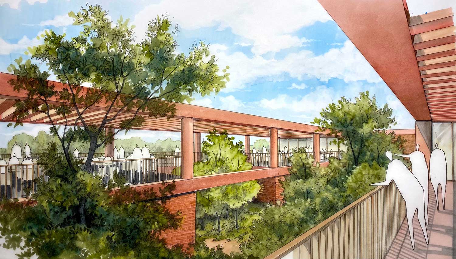 Scale esterne punteggiano i percorsi che attraversano l’architettura, mentre le travi fungono anche da brise-soleil degli spazi aperti e delle aree più densamente costruite.