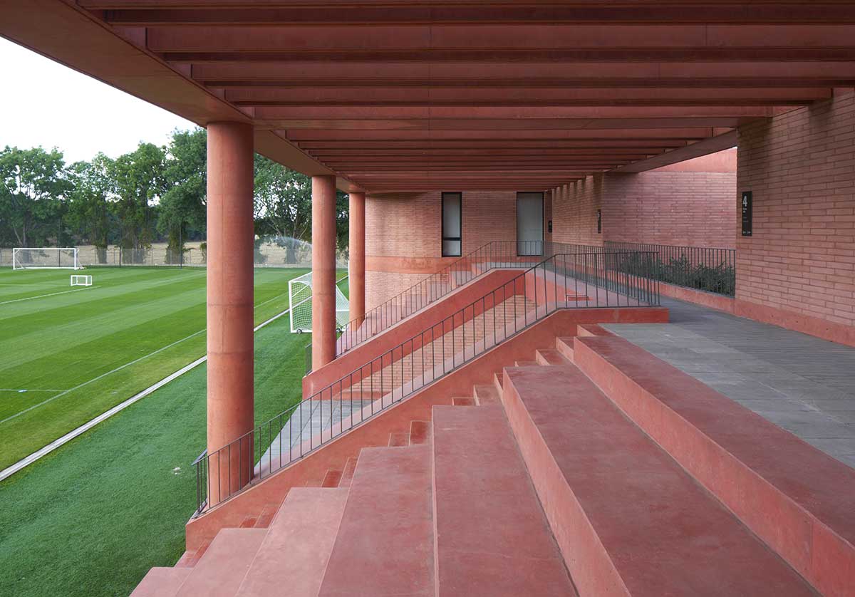 Così, lungo gli 8.300 metri quadrati del volume lineare costruito si alternano ambienti coperti (club house, uffici, alloggi, strutture per la scienza sportiva, tribune che affacciano sui sei campi di calcio per gli allenamenti) e spazi aperti fatti di percorsi ombreggiati concepiti come vicoli urbani, cortili interni e piccole piazze di paese.