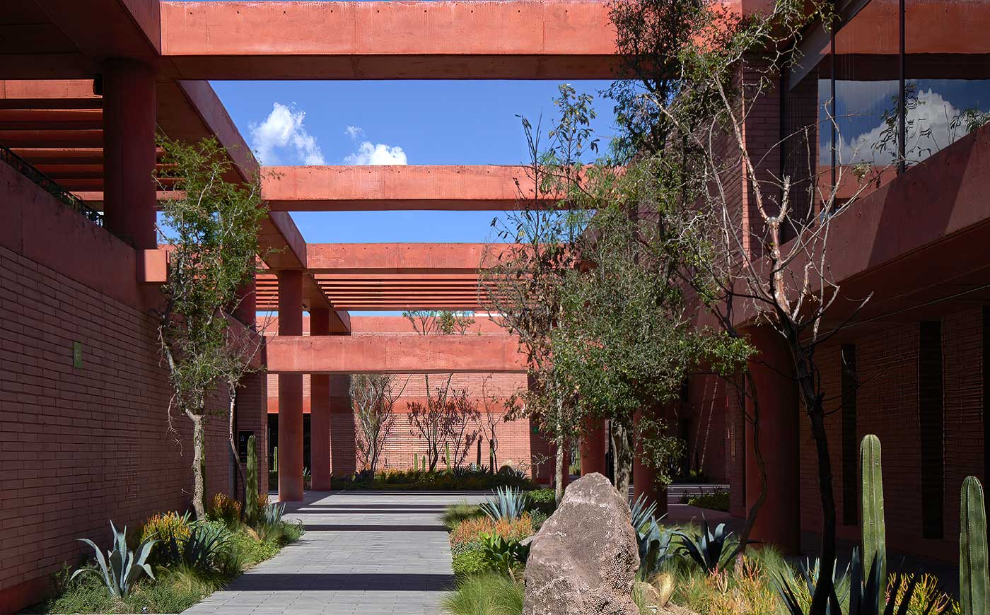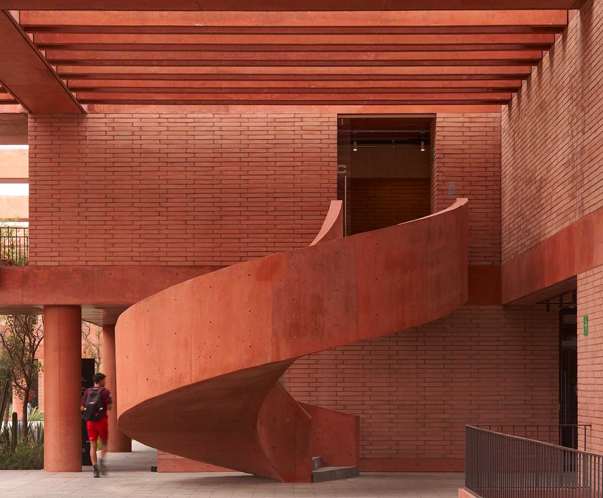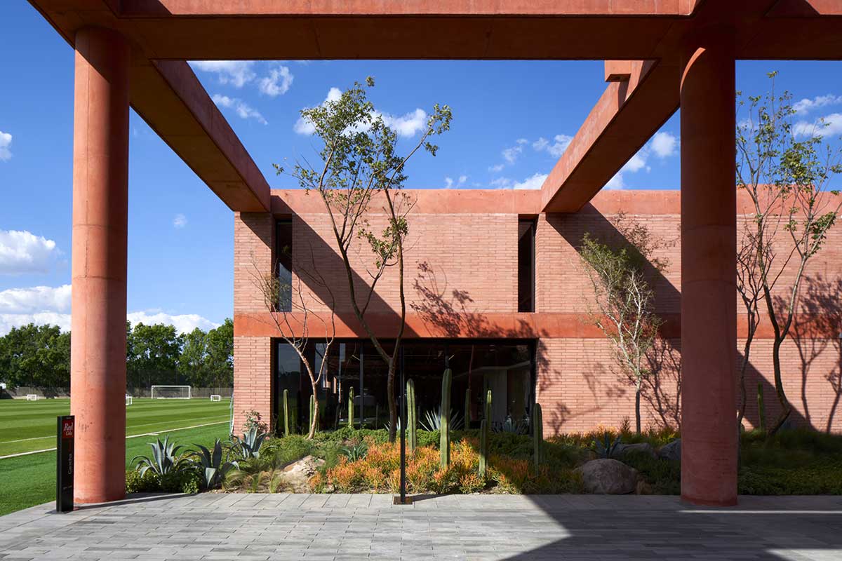 Il colore rosso monocromatico del progetto – con l’argilla dei mattoni e il cemento pigmentato – richiama sia l’identità della squadra sia il tradizionale mattone messicano.