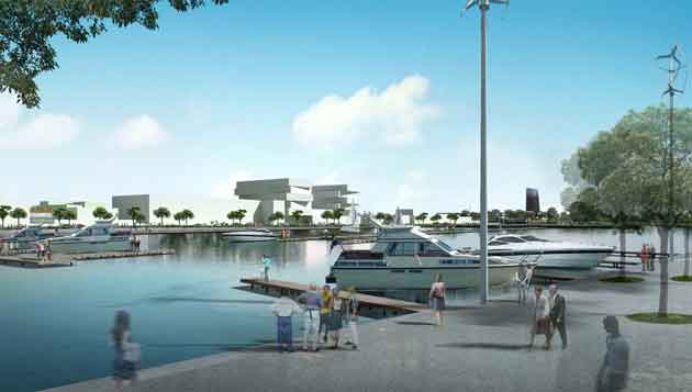 Render del porto turistico Marina di Santa Cecilia e del quartiere VerdeAbitare che potrà sorgere alle sue spalle (©UFO)
