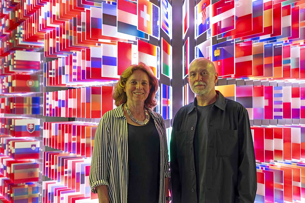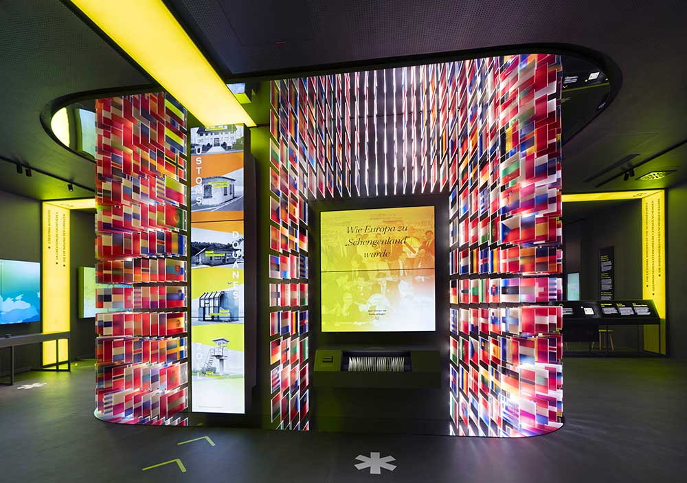 All’esterno del Cubo un pattern di bandiere europee, amplificato da un sistema specchiante, simboleggia i valori di unione e cooperazione, mentre l’installazione interna racconta le testimonianze di persone provenienti dall’interno e dall’esterno dello spazio Schengen.