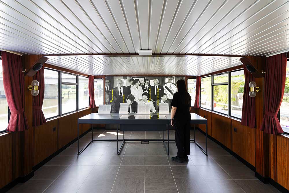 L’intervento ha riguardato anche la riqualificazione e il riallestimento del battello e della sua struttura storica, mantenendo l’impianto originale dell’imbarcazione e instaurando un dialogo con il nuovo allestimento museale. Nella sala del ponte superiore le finiture e i materiali, come le tende e le lampade, richiamano l’atmosfera e l’estetica di quarant’anni fa, integrandosi con le installazioni e gli arredi contemporanei. Per il ponte inferiore del battello è stato ideato un sistema flessibile e multifunzionale, in grado di assumere configurazioni spaziali differenti e di rispondere a diverse necessità.