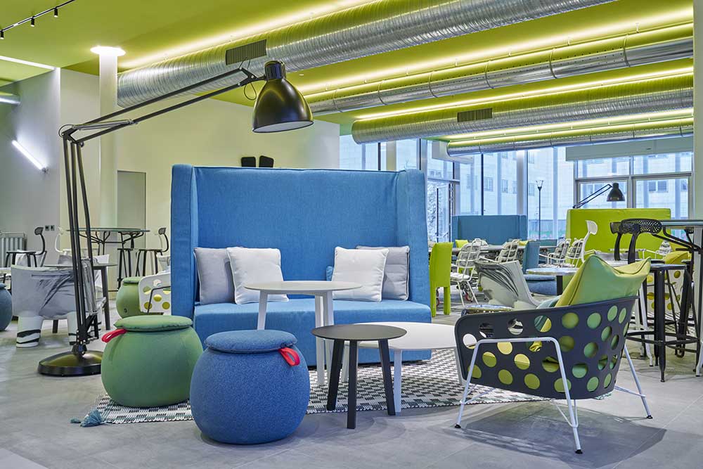 Al piano terra del padiglione sono collocati il ristorante caffetteria di BiM, Pavilion – sips&bites by Fuorimano, in uno spazio dai colori accesi con tocchi pop progettato da Paola Navone – Otto Studio che include anche una lounge e un’arena per eventi, talk e conferenze.