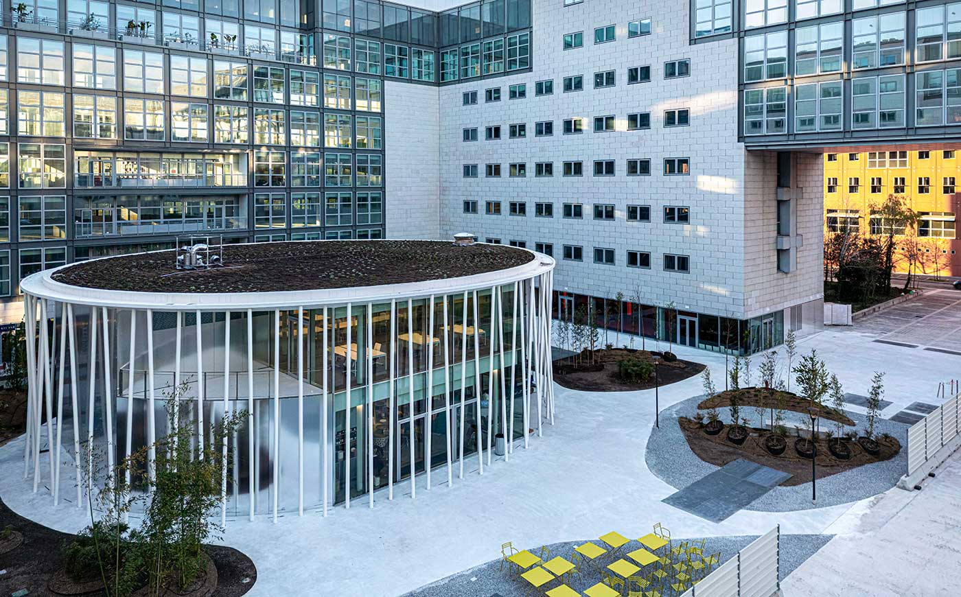 Disegnato da Piuarch (i cui soci all’epoca lavoravano proprio in Gregotti Associati), il nuovo volume architettonico si sviluppa su due piani fuori terra, per un totale di 800 metri quadrati, e con una forma libera, quasi circolare, rompe la rigidità dello spazio ortogonale del complesso di Viale Pirelli 10.