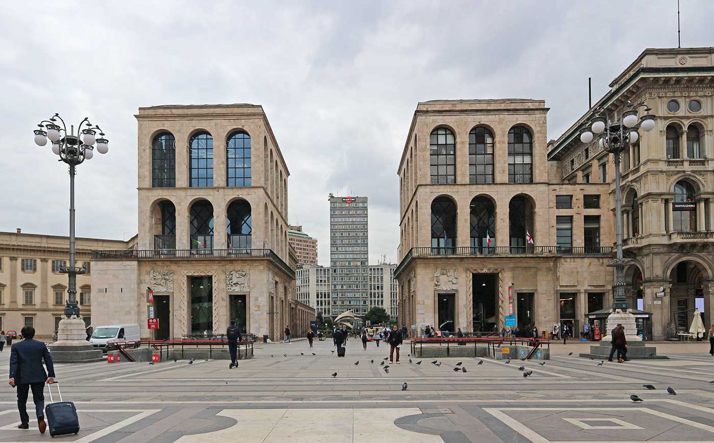 Simmetrico alla Galleria Vittorio Emanuele II, il complesso dell’Arengario, costruito tra il 1937 e il 1956 su progetto di Piero Portaluppi, Giovanni Muzio e Enrico Griffini, con il successivo intervento di Vico Magistretti, completò il rinnovamento della Piazza del Duomo dandole l’impronta architettonica che conserva ancor oggi.