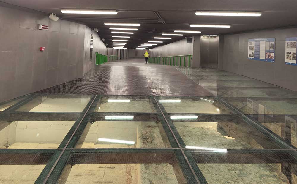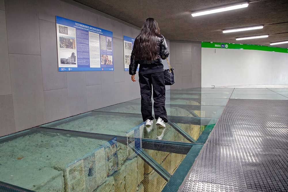 Milano, un tunnel pedonale con vista sulle mura medievali che collega due linee MM