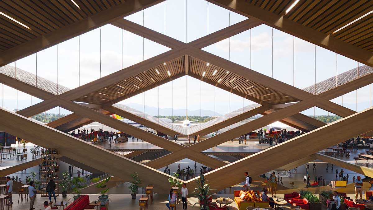Il progetto prevede la realizzazione di un aeroporto internazionale (sotto, nei render di Brick Visual), nuovi collegamenti ferroviari, di una centrale idroelettrica e di costruzioni che promuovano, interpretandoli con l’architettura degli edifici, i nove principi cardine per misurare l’Indice di Felicità Nazionale: benessere psicologico, salute, istruzione, qualità di vita, tempo libero, ecologia, buon governo, diversità culturale e vitalità delle comunità.