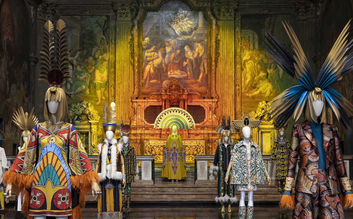 La luce nella cornice barocca della chiesa sconsacrata di San Paolo Converso dona un’aura di sacralità all’intera scenografia del brand milanese di J.J. Martin. Una luce calda e rassicurante abbraccia i manichini, protagonisti dell’installazione con i loro abiti estrosi ed eleganti e i copricapi che ricordano divinità lontane nel tempo e nello spazio.