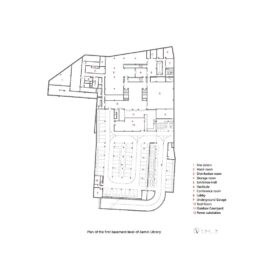 La nuova biblioteca, alta due soli piani (un livello sotterraneo ospita una mostra sulla vita – indovinate di chi), al primo piano è rivestita di pannelli di cemento ad alte prestazioni (Uhpc) di colore rosso scuro che nella forma ‘traforata’ con cui sono realizzati richiamano gli scuri e i profili in legno delle finestre degli edifici tradizionali.