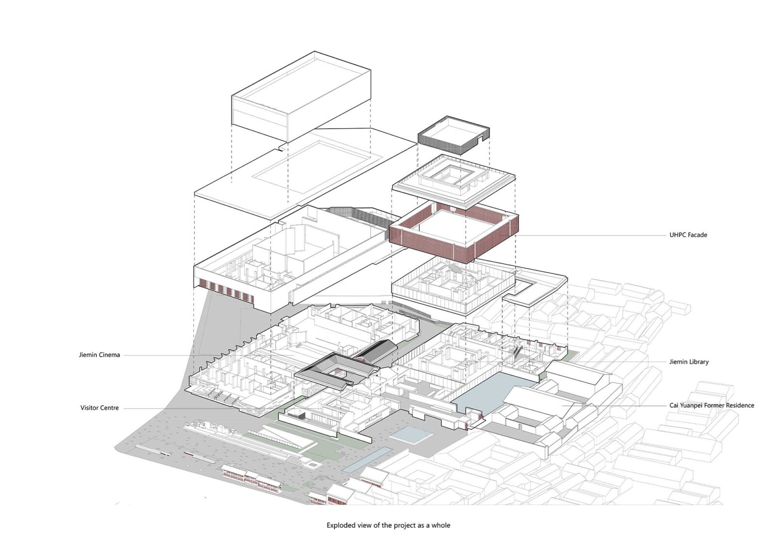 Al centro dell’intervento la demolizione delle strutture dell’ex-quinto ospedale di Shaoxing, costruzione funzionale alle esigenze sanitarie ma estranea al carattere storico del quartiere, e la costruzione, al suo posto, della nuova biblioteca Jiemin, orientata in maniera da instaurare un dialogo con una villa di stile tradizionale a est e con l’edificio di un vecchio cinema costruito nei primi anni Cinquanta, ristrutturato conservandone il colonnato frontale e trasformato in teatro, a ovest.