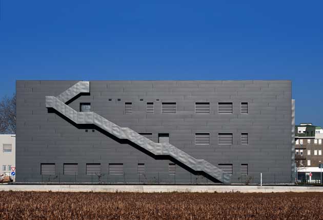 Vista nord-ovest dell´edificio, con l´unica facciata vetrata e la scala di emergenza che segna il lato ovest (foto Gardini‹Mazzoli) |