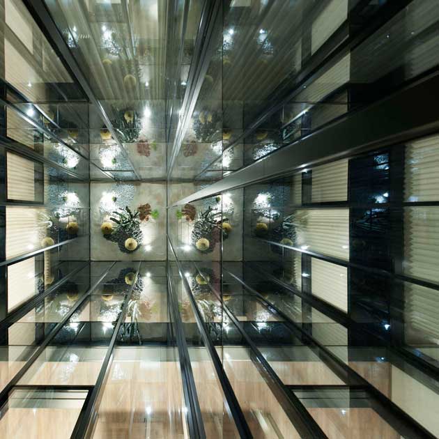 Al contrario dell’opacità dell’involucro esterno, le partizioni che delimitano gli ambienti interni sono ovunque possibile trasparenti, favorendo tra l’altro la diffusione della luce naturale proveniente dalla facciata nord.