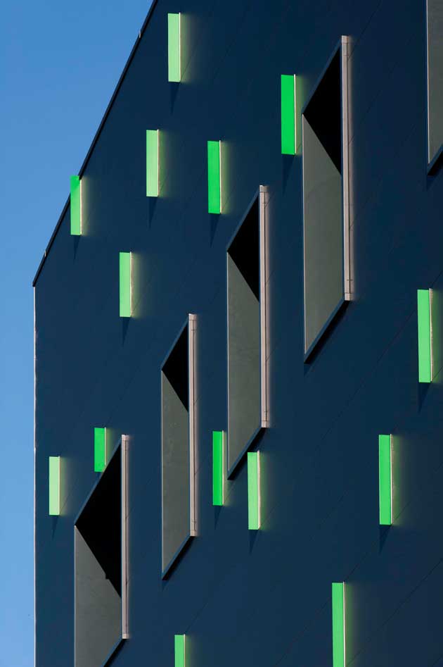 Particolare della facciata, con le lastre ortogonali di colore verde che segnano il ritmo |
