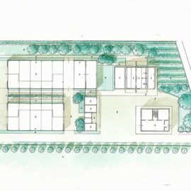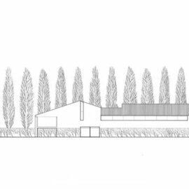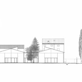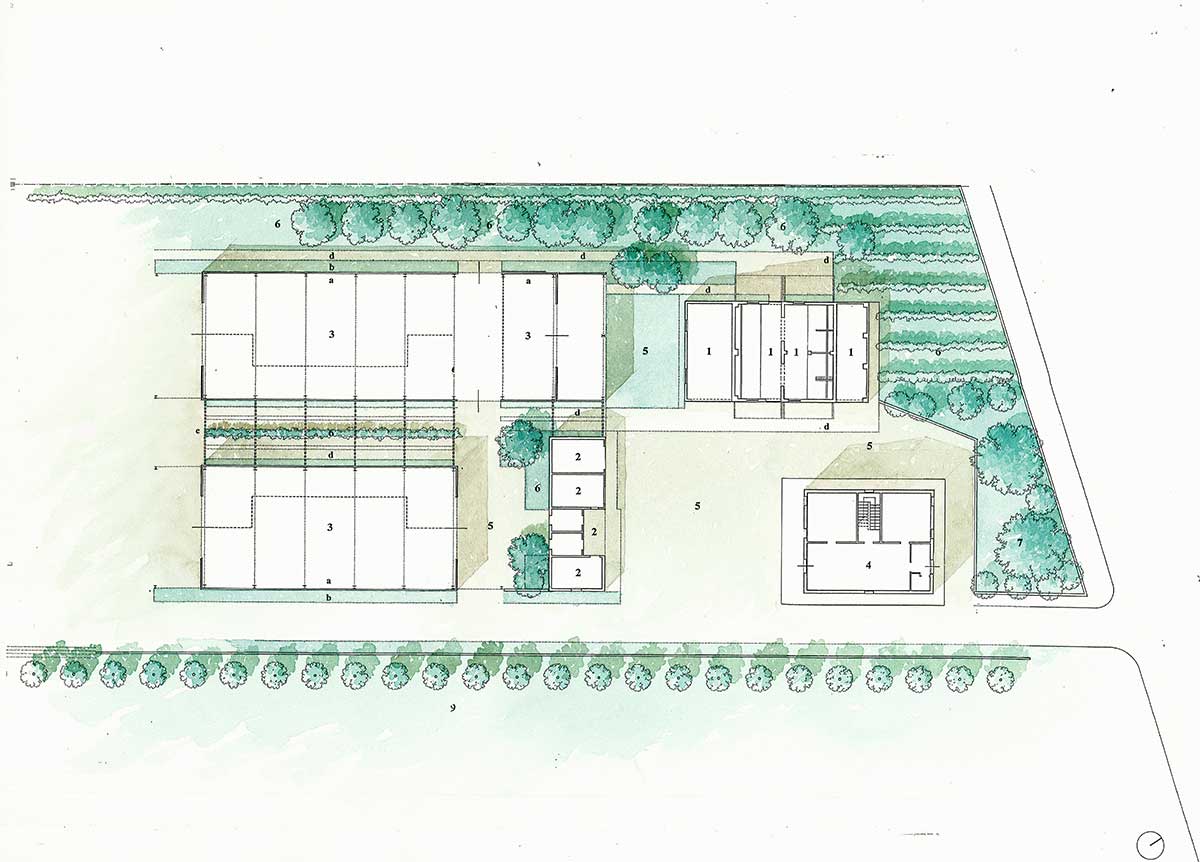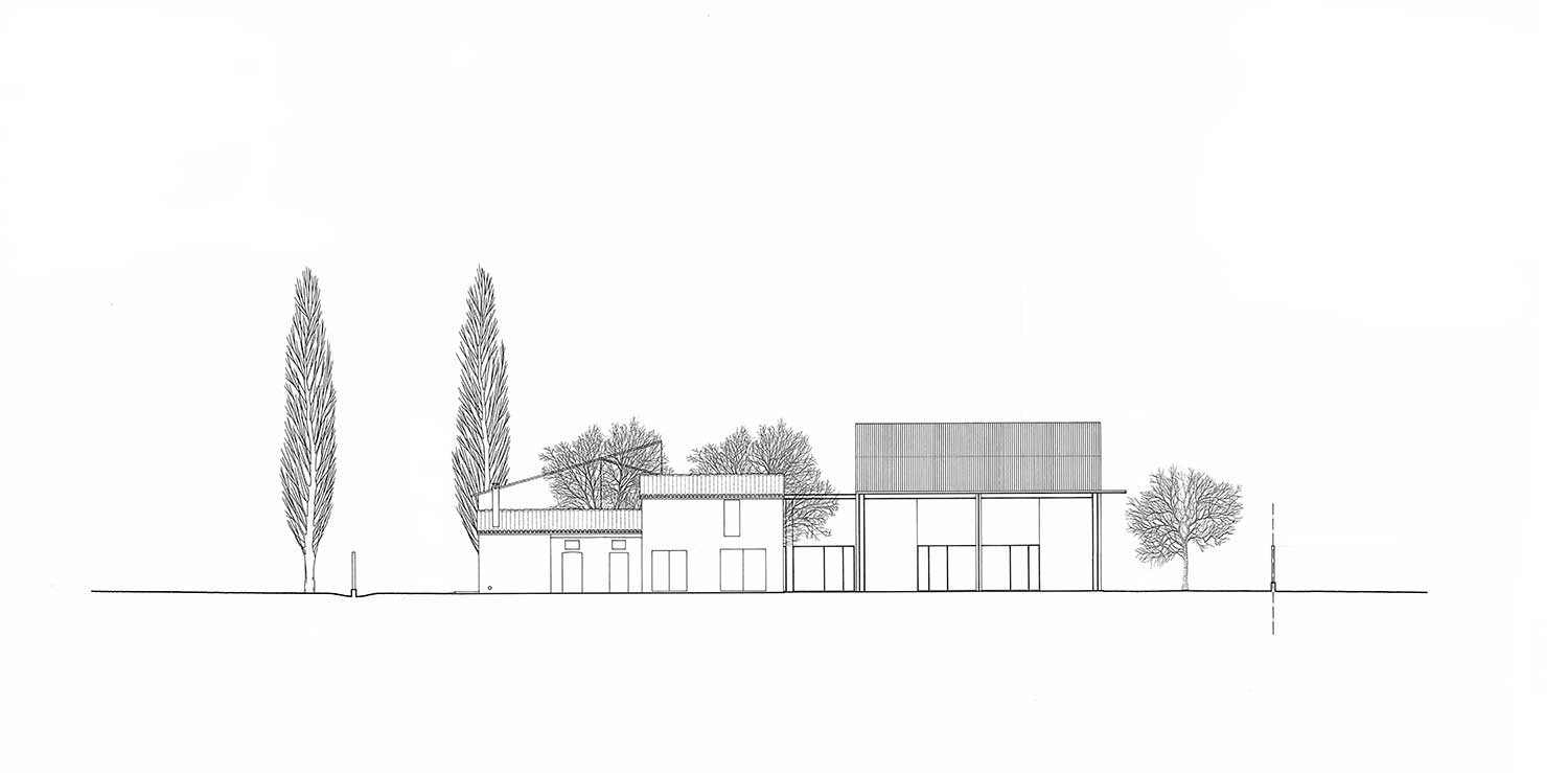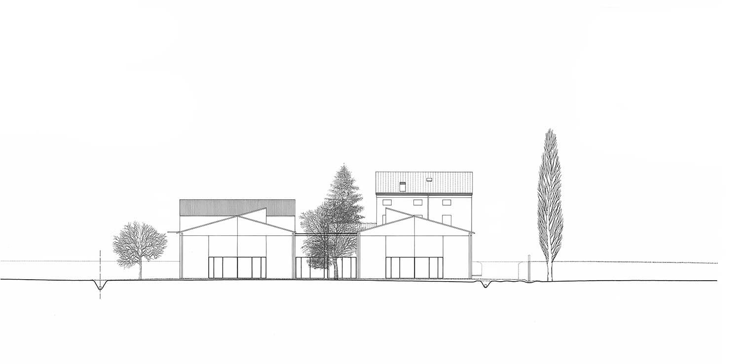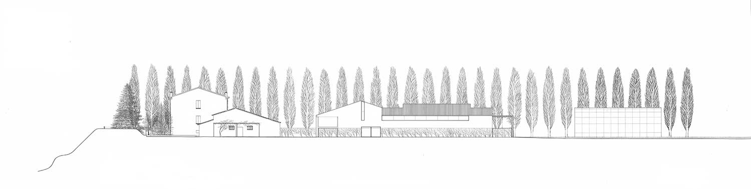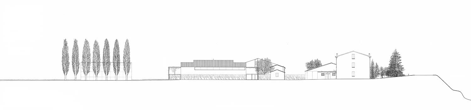 I due nuovi edifici, riconfigurati per migliorarne la funzionalità, si articolano lungo la nuova spina dorsale di una galleria agricola coltivata che traguarda il paesaggio, moltiplicandone i piani percettivi. I loro fronti riflettono, incorporandolo, l’orizzonte naturale.
