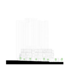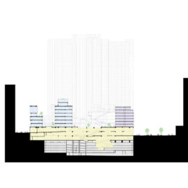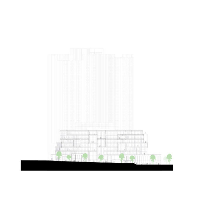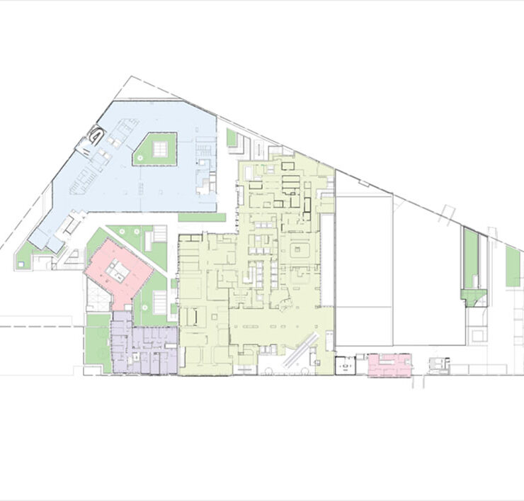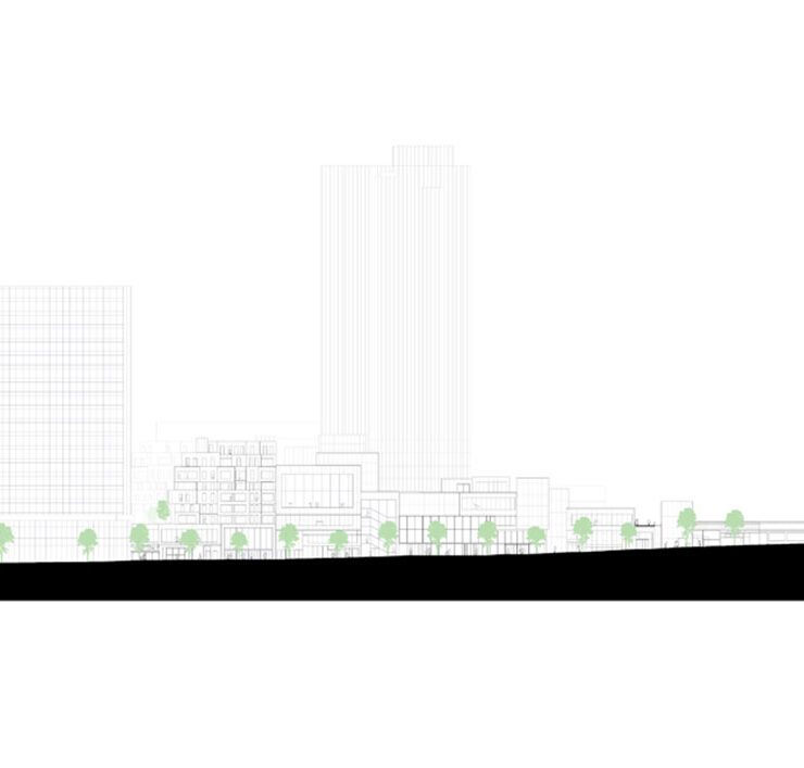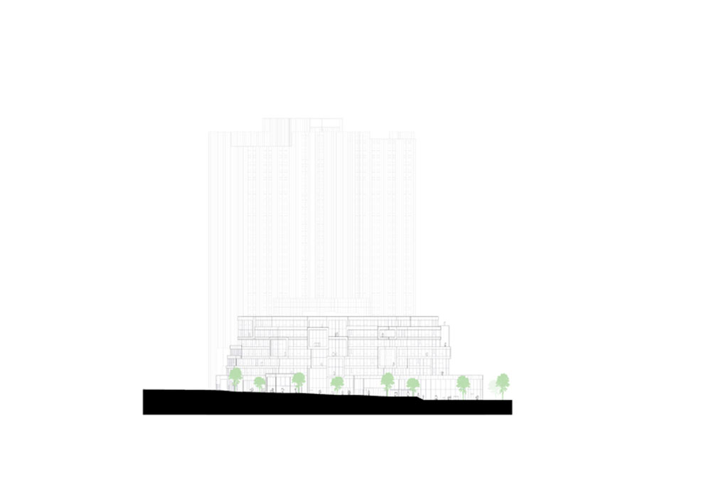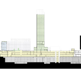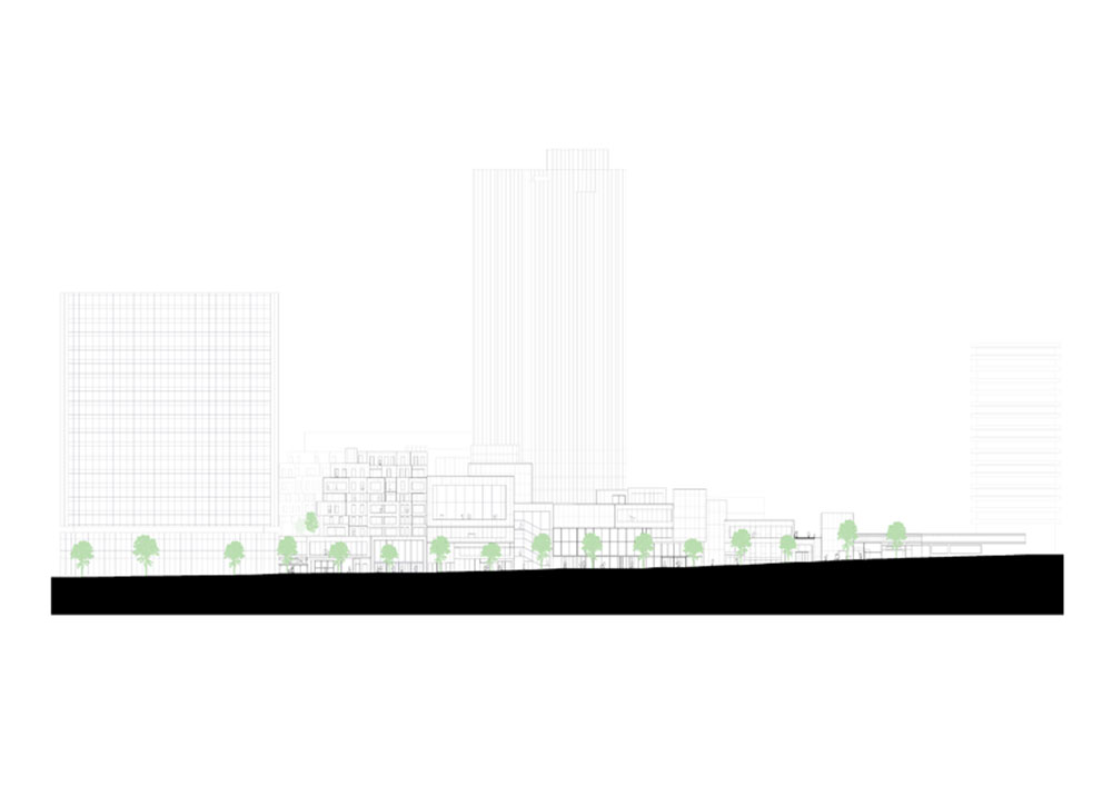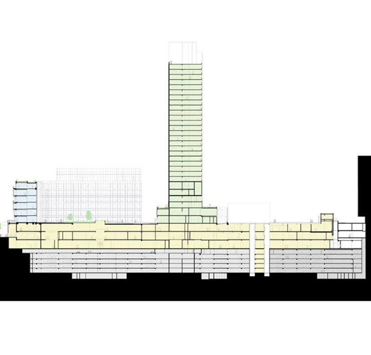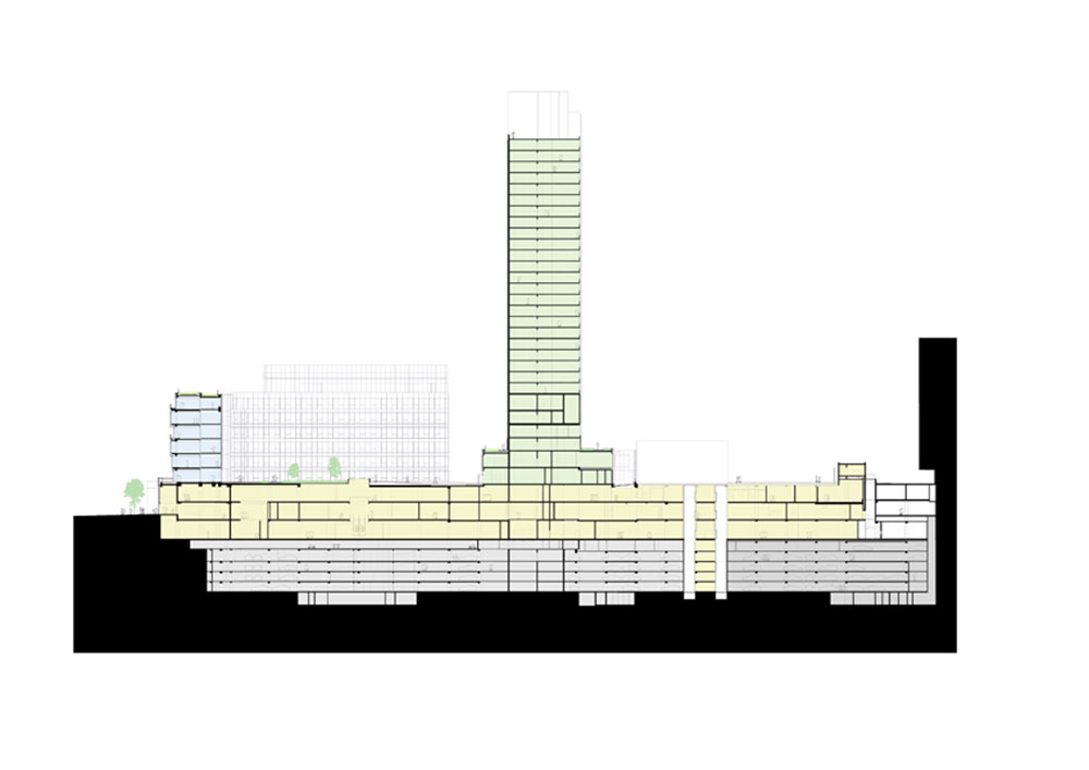 Il progetto ha razionalizzato le diverse destinazioni d’uso del complesso originario – un hotel, un centro commerciale, uffici e una biblioteca – densificando gli spazi a disposizione o concentrando alcune funzioni, come nel caso degli uffici, che ora occupano un blocco di sette piani a est del sito.