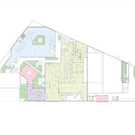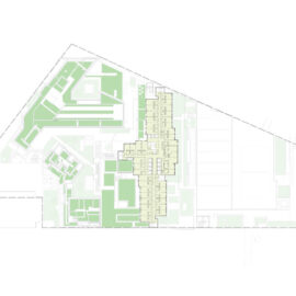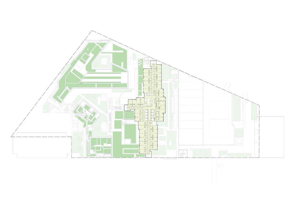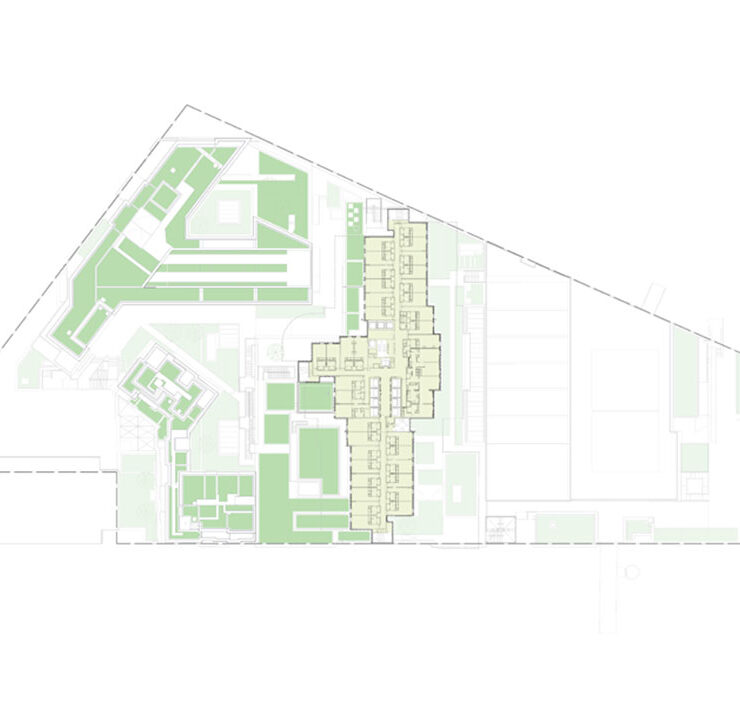 La nuova distribuzione ha permesso di ampliare le destinazioni d’uso dell’edificio. Nel cuore del complesso, infatti, sono stato realizzati 62 alloggi di edilizia convenzionata e un asilo. Per l’aggiunta del blocco abitativo è stata utilizzata una struttura in legno in modo da ridurre l’impronta di carbonio della nuova costruzione.