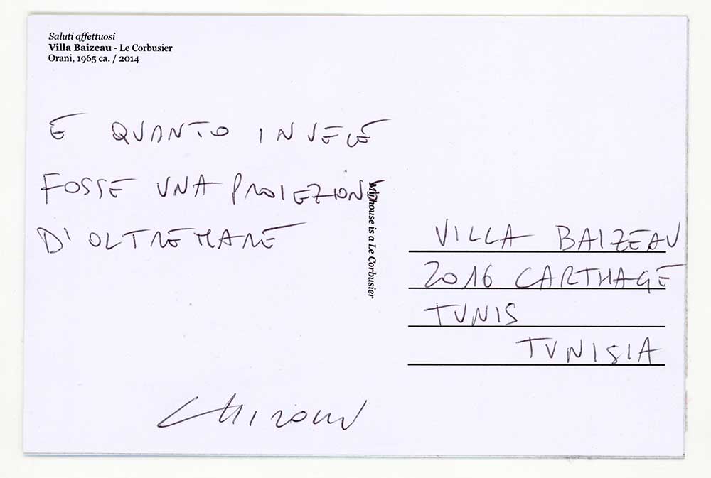 La più recente di queste esperienze si sviluppa a Tunisi dove, sulla collina di Sainte Monique a Cartagine, si trova Villa Baizeau, l’unico edificio progettato da Le Corbusier in Tunisia, costruita tra il 1928 e il 1930. Qui la residenza d’artista di Chironi è però solo virtuale perché la villa, che sorge all’interno della tenuta presidenziale, è off-limits.