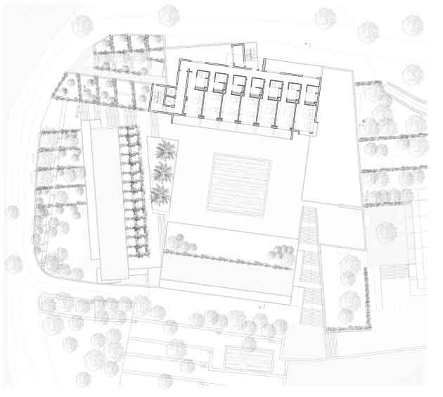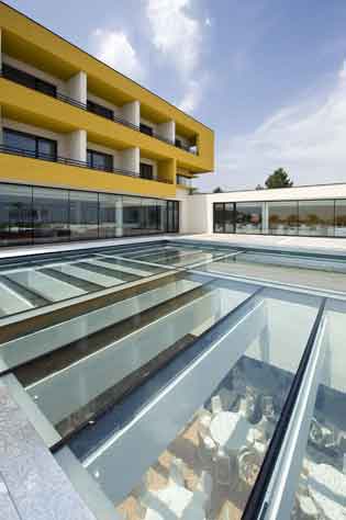 Soluzioni inattese assicurano un costante dialogo tra spazi interni ed esterni, come nel caso dell’ampia sala conferenze ricavata all’interno di un vuoto a doppia altezza situato sotto la corte panoramica, chiusa in copertura da una vasca d’acqua con fondo trasparente che lascia filtrare la luce naturale e mitiga l’effetto serra. O come nel caso dell’ampia sala spa dell’albergo chiamata “giardino delle Esperidi”, caratterizzata da grandi pareti vetrate e da una piscina interna che si prolunga sulla corte esterna. La fusione tra paesaggio e ambiente costruito è ribadita dalla sistemazione dei terrazzamenti in pietra lavica e dei percorsi che attraversano il parco-giardino.