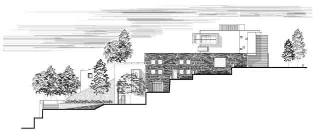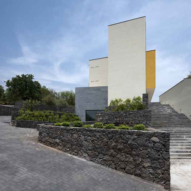 L’impianto progettuale ha previsto un insieme di volumi minimali a due piani distribuiti su quote diverse attorno a una corte centrale quadrangolare che funge da piazza panoramica. Le scelte formali e materiche adottate rappresentano una fusione di genius loci e nuovo linguaggio contemporaneo. La soluzione di attacco a terra, ad esempio, è intimamente legata alla natura del contesto ambientale e gli imponenti basamenti murari di pietra lavica evocano la tradizione costruttiva locale, mentre le volumetrie sottolineano la propria natura artificiale distaccandosi in parte dal suolo tramite alti pilotis e logge aggettanti. Il sistema delle logge, che generano vaste aree ombreggiate, contrasta con le volumetrie piene delle restanti porzioni architettoniche, contrassegnate nella loro orizzonta lità da tagli minimali.