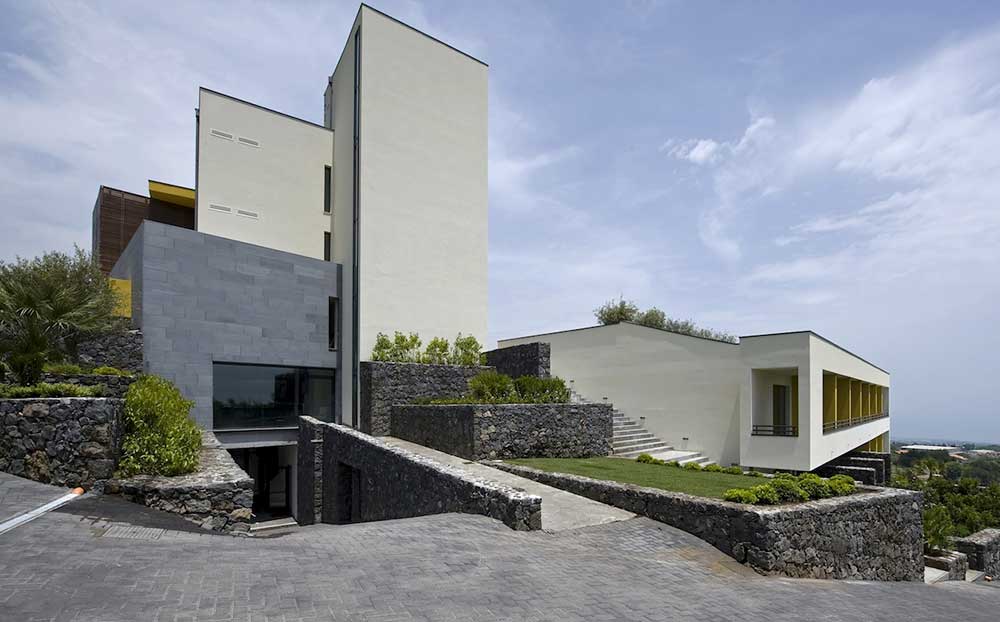 L’impianto progettuale ha previsto un insieme di volumi minimali a due piani distribuiti su quote diverse attorno a una corte centrale quadrangolare che funge da piazza panoramica. Le scelte formali e materiche adottate rappresentano una fusione di genius loci e nuovo linguaggio contemporaneo. La soluzione di attacco a terra, ad esempio, è intimamente legata alla natura del contesto ambientale e gli imponenti basamenti murari di pietra lavica evocano la tradizione costruttiva locale, mentre le volumetrie sottolineano la propria natura artificiale distaccandosi in parte dal suolo tramite alti pilotis e logge aggettanti. Il sistema delle logge, che generano vaste aree ombreggiate, contrasta con le volumetrie piene delle restanti porzioni architettoniche, contrassegnate nella loro orizzonta lità da tagli minimali.
