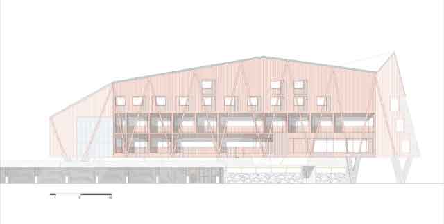 L’edificio è suddiviso in due ali, una a est rivolta verso la vallata di Barcis, l’altra verso sud-ovest e il centro di Piancavallo, collegate da spazi di aggregazione. Il piano primo, il più ampio dell’edificio, è caratterizzato da un ampio spazio a tripla altezza. I nuovi livelli della struttura sono stati realizzati con pannelli in legno lamellare sia per le pareti portanti che per i solai e rivestiti esternamente in pietra e legno di larice, utilizzato anche per i frangisole posti sulla facciata sud.
