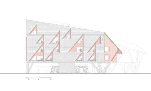 Dell’edificio preesistente è stato conservato unicamente il piano terra, riconfigurato come area d’ingresso del 1301 Inn, che accoglie tutte le funzioni connesse alla gestione e ai servizi dell’hotel, mentre ai piani soprastanti è stata realizzata una struttura totalmente nuova, che rievoca le tradizioni costruttive della montagna esattamente nel momento in cui se ne discosta tecnologicamente, strutturalmente e formalmente, esagerando gli aspetti vernacolari sia nelle falde di copertura sia nei metodi di sospensione dal suolo. Si vengono così a creare spigoli e aree esterne inaspettate tanto all’uomo quanto alla natura, dove la neve si può accumulare e il ghiaccio scendere liberamente formando spettacolari stalattiti, decorazioni autenticamente naturali e dipendenti dalla meteorologia anziché natalizie-cinesi a tempo con le feste comandate.