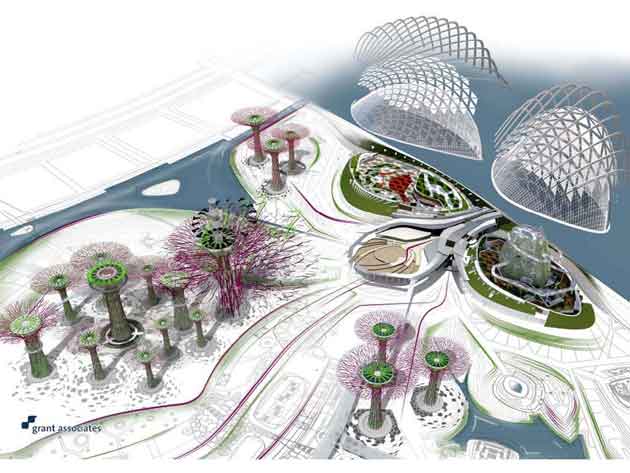 Le gigantesche cupole vetrate del Flower Dome (per specie vegetali del Mediterraneo e dei climi asciutti temperati) e della Cloud Forest (clima umido delle zone montuose tropicali) coprono complessivamente una superficie di 28mila mq e accolgono circa 226mila specie vegetali all’interno di un volume complessivo di quasi 350.000 mc. Si tratta di specie provenienti da tutti i continenti, in molti casi minacciate dal cambiamento climatico e dalla perdita di habitat causata dalle attività dell’uomo. Associando informazione a intrattenimento (all’interno del Flower Dome vi sono anche una food court e un’area eventi con capienza di mille persone), questi orti botanici del nuovo millennio si propongono di far crescere la consapevolezza del pubblico nei confronti dell’ecosistema. Gli accorgimenti tecnologico-impiantistici adottati riducono di circa il 30% il non indifferente fabbisogno energetico del complesso: gli oltre 6.000 pannelli vetrati delle cupole sono in vetro selettivo per abbattere il surriscaldamento garantendo al contempo il massimo apporto di luce naturale; un sistema domotico governa le schermature solari; l’aria interna viene deumidificata e poi raffrescata, riducendo così il fabbisogno energetico del condizionamento; scambiatori di calore acqua/aria affogati nelle piastre in CA e un sistema di ventilazione forzata raffresca le cupole solo al livello terreno mantenendo la giusta temperatura per tutta la loro altezza interna (nella Cloud Forest raggiunge i 54 metri). Larga parte dell’elettricità necessaria per il condizionamento delle biosfere viene prodotta da una turbina a biomassa che proviene in parte dagli scarti vegetali delle biosfere. Il calore in eccesso è utilizzato per rigenerare il liquido del processo di deumidificazione.