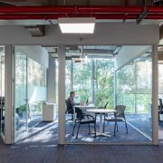 La copertura è anche un dispositivo di mitigazione delle aree esterne, in quanto sono stati creati spazi di transizione semi-outdoor che regolano il microclima tra esterno, interno e zone ombreggiate. Inoltre, un serbatoio da 30 metri cubi di acqua immagazzina l’acqua piovana per riutilizzarla per l’irrigazione.