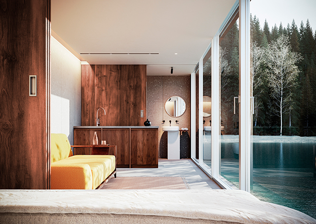 L’ambiente bagno presenta un lavabo freestanding e la doccia con cromoterapia permette di godere di viste panoramiche attraverso la vetrata a tutta parete; infine, una mini-cucina con tavolino annesso per la colazione o per un veloce pranzo, ma anche per una cena a lume di candela.